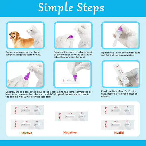 .Zestaw testowy CDV AG Sophbabioma na celu zapewnienieWyniki jakościowe w ciągu 10–15 minut, wykrywanie antygenów wwydzieliny oka i nosaStosując metodę immunochromatograficzną z podwójnym przeciwciałą. Z wyraźnymC-line i linia T.Wskaźniki wyników, ten zestaw obsługuje specjalistów weterynaryjnych pierwszej linii z pewnością i szybkością.